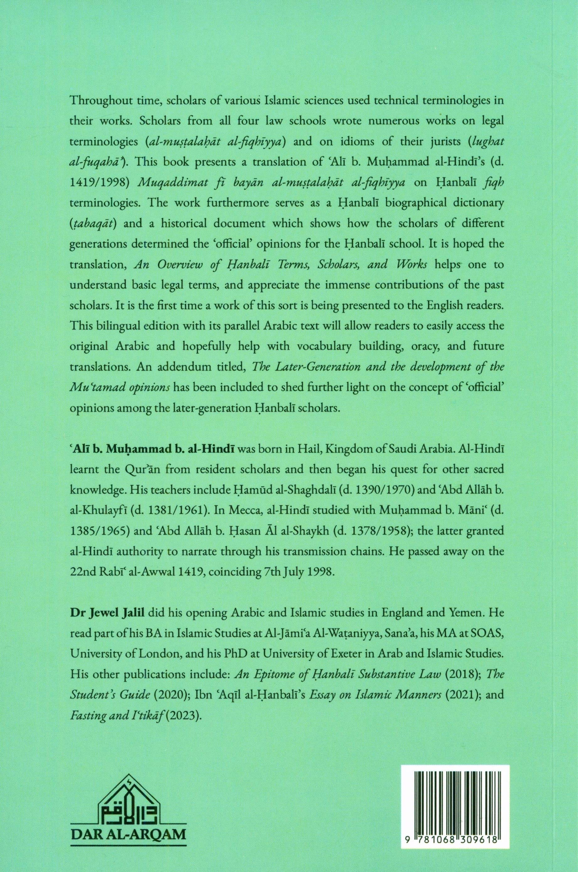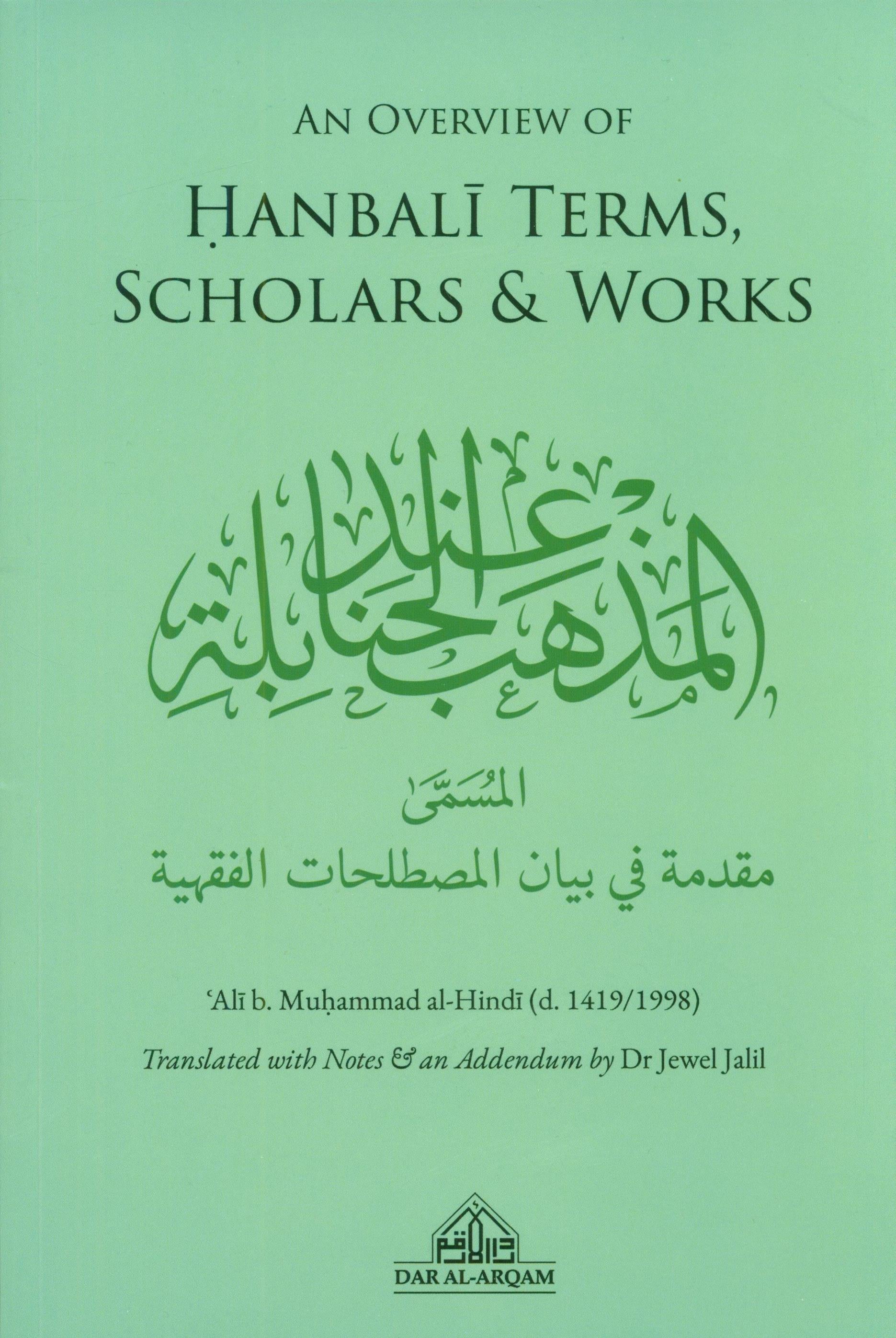 Throughout time, scholars of various Islamic sciences used technical terminologies in their works. Scholars from all four law schools wrote numerous works on legal terminologies (al-muştalabat al-fiqhiyya) and on idioms of their jurists (lughat al-fuqaha). This book presents a translation of 'Ali b. Muhammad al-Hindi's (d. 1419/1998) Muqaddimat fi bayan al-mustalahat al-fiqhiyya on Hanbali fiqh terminologies. The work furthermore serves as a Hanbali biographical dictionary (tabagat) and a historical document which shows how the scholars of different generations determined the 'official' opinions for the Hanbali school. It is hoped the translation, An Overview of Hanbali Terms, Scholars, and Works helps one to understand basic legal terms, and appreciate the immense contributions of the past scholars. It is the first time a work of this sort is being presented to the English readers. This bilingual edition with its parallel Arabic text will allow readers to easily access the original Arabic and hopefully help with vocabulary building, oracy, and future translations. An addendum titled, The Later-Generation and the development of the Mu'ramad opinions has been included to shed further light on the concept of 'official' opinions among the later-generation Hanbali scholars.